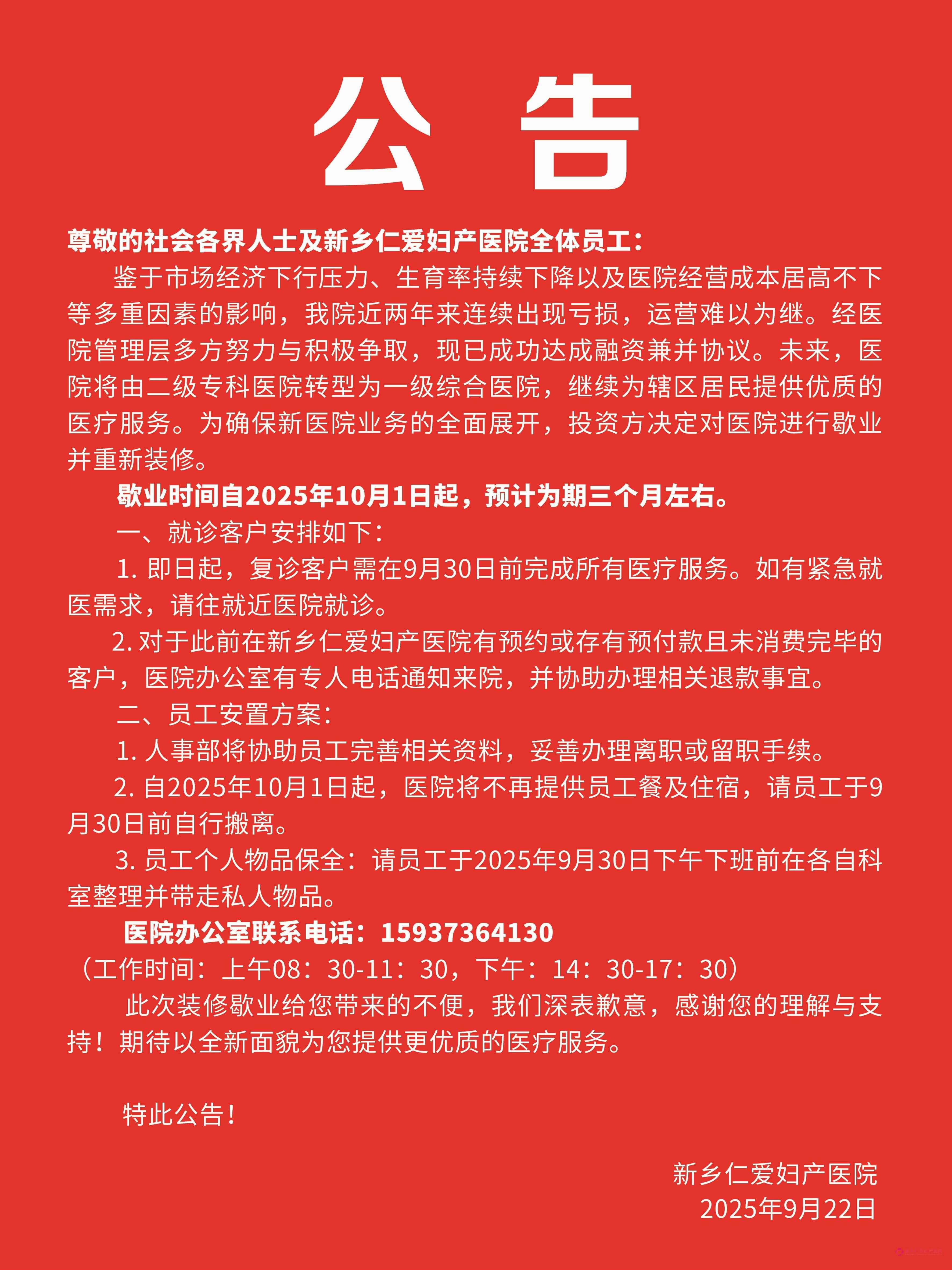 通知丨关于新乡仁爱妇产医院歇业的公告
